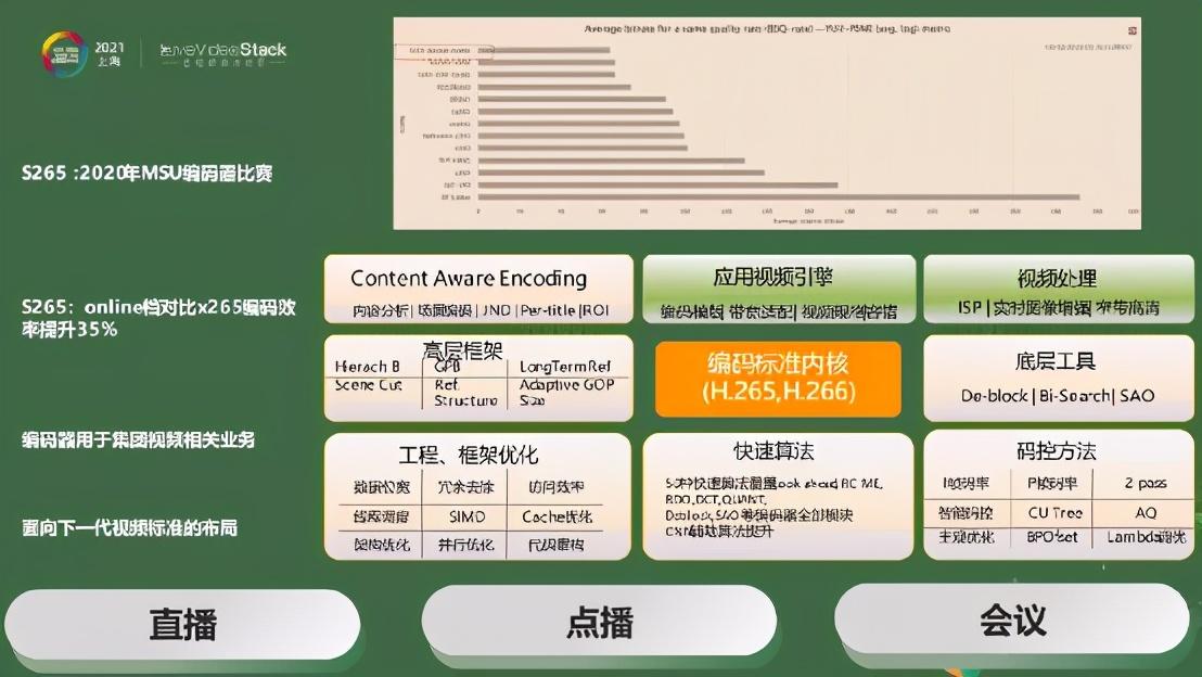 我们从H.265这个编码器来讲呢,其实单点效果也是不错的。内部有一个我们叫做S265的编码器,参加了去年MSU编码器比赛,PSNR的一个档位上获得了第一名的成绩。技术上来讲它比x265在编码效率上提升了很多,差不多35%。这个编码器用于很多业务,不光是淘系业务,同时也是很多集团相关的业务,比如说淘宝直播肯定在用这样的编码器,点播里不论是长视频还是短视频也在用。短视频包括逛逛,商品详情页的业务,长视频包括优酷也在调用我们的编码器,当然这款编码器可能也会做一些其它场景所需要的改造。在钉钉会议,在RTC这样的场景,S265也是可以被大家所使用的。我们在集团内部做了比较好的输出,同时我们也在布局下一代的编解码器,比如H.266/VVC的编解码器,现在已经可以开始在一般的手机上做到实时解码了。同时我们也希望编码器能慢慢做起来,可能开始它的编码效率不能完全体现,但希望过两三年后能逼近H.266在理想情况下的编码效率。