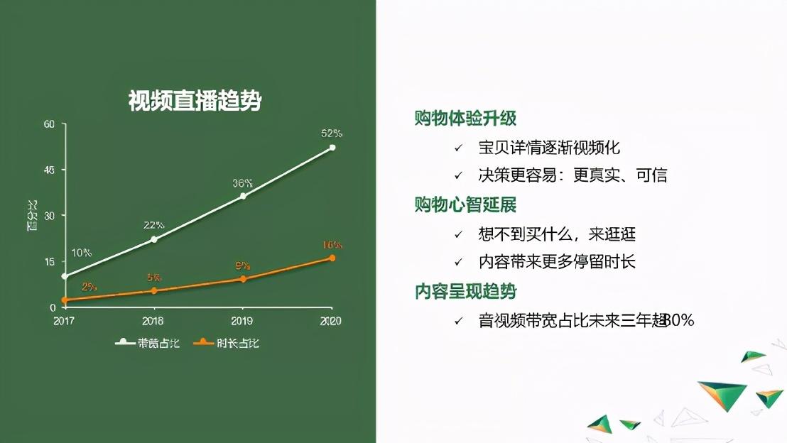 我们认为基于视频的服务可以增强购物体验。比如可以让宝贝详情更真实、可信。视频内容也可以增加用户的停留时长。所以我们可以看到,无论是在带宽、还是停留时长方面,视频在所有的内容中占比逐年增加。可以说,整个淘系内容正在加速迈入视频时代的进程中。