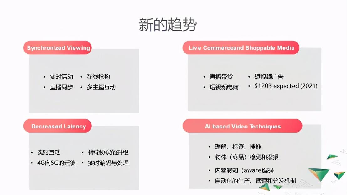 我们既需要面对之前提到的高清晰、低计算成本和低带宽这种持续的需求,同时又有更多新的趋势需要跟进。这中间有不少的新机会,我们都要去抓。但是抓住机会的同时也相应带来了不少的困难和挑战。