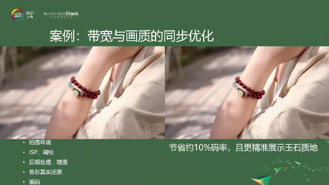 这里介绍一个案例。左边是一开始的情况,我们目的是希望降低码率的同时能更好得展示商品。可以看到右边展示的是提升之后的效果,码率节省了约10%,同时商品(玉石)的质地被更加精准地展示了出来。这背后除了拍摄环境要做好之外,还有一系列的技术因素,比如ISP要控制好,要做很好的调校,同时要做视频处理,包括增强的算法。另外,商品展示的部分要做更好的色彩还原,这一部分最终可能要用到HDR(高动态范围)和WCG(宽色域)。最后我们也需要做好编解码,使得在画质很高的情况下带宽不至于控制不住。