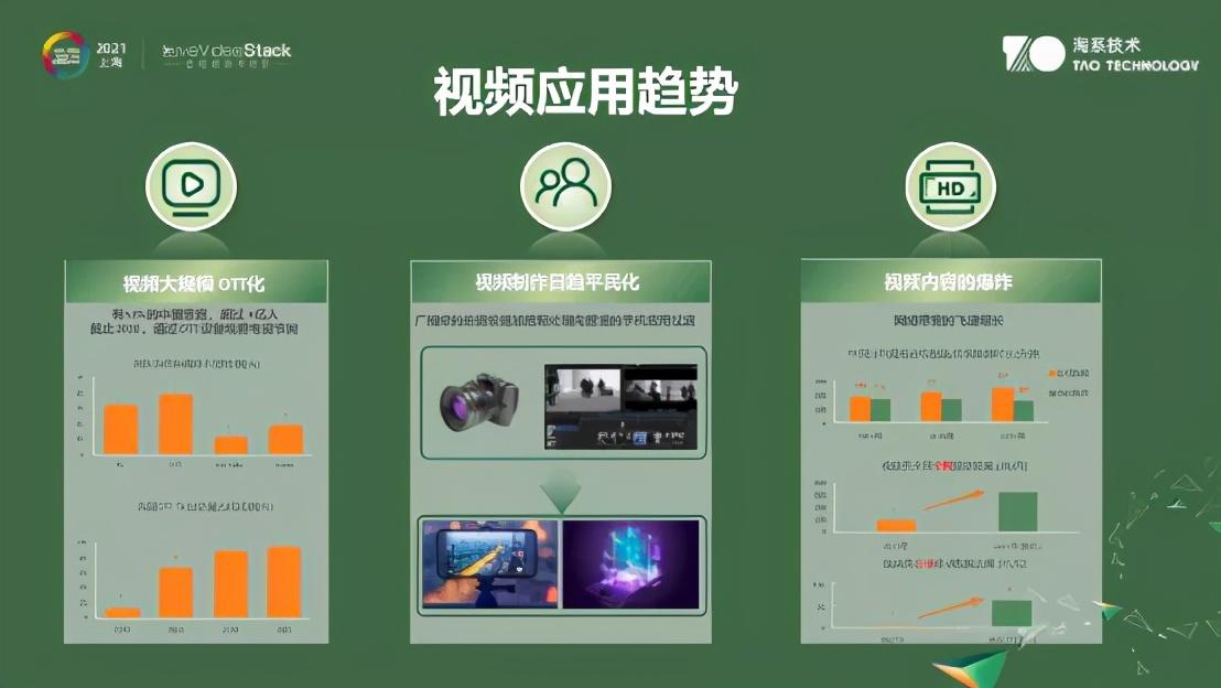 这些流量主要集中在我们常说的短视频、点播、直播这些领域,淘系技术的一个重要任务就是让我们平台上的这些短视频,直播视频内容都变成高质量的,并且追求整个过程的低成本,最终普惠类似影院级的视频体验。