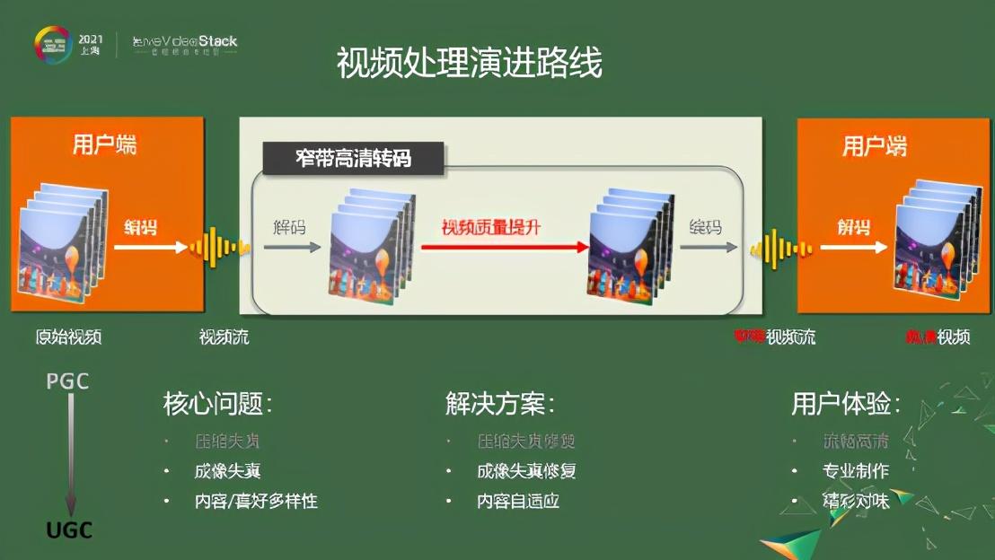 处理业务时遇到的问题,推动着我们演进相关的解决方案。首先要解决的就是传统视频应用中主流的压缩失真问题,就是将编码做得比较好,这样看起来也比较流畅,同时也尽量接近高清。但是慢慢发现,随着主流内容从PGC向UGC的过度,我们发现摄像头效果不可控,大家拍摄的方式、技巧,以及拍摄环境也不可控,图像失真慢慢变成了成像方面的失真,所以需要我们尽量修复成像方面的失真,使之达到专业制作的效果。