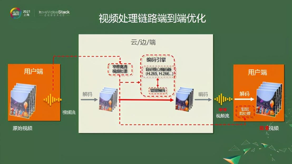 举一个例子来说视频处理的未来趋势是什么样的。这个图比较简单,就是一个视频的整体链路,可以做云上的计算,可以做云/边/端的结合和联动。技术上有窄带高清视频处理,有核心编码引擎去做符合H.265、H.266标准的编码器,背后我们也会做智能编码。甚至端上有一些比较好的机型,可以做端上的智能后处理——整个做下来是一个端到端的链路。