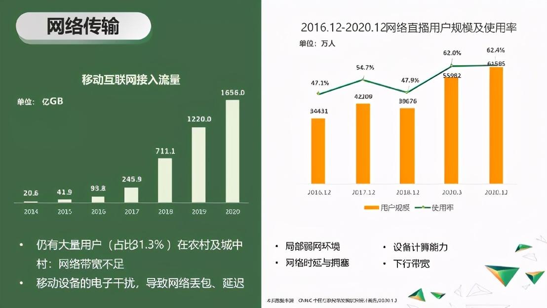 几大挑战里面我认为第一个依然是网络传输方面的。比如观看网络直播的用户越来越多,对网络资源的消耗越来越大等等。但是,相当一部分用户还是处于比较差的弱网环境,同时很多人是通过移动设备接入的,移动设备之间又存在电子干扰,所以网络延时、卡顿和丢包都一直在发生。同时,一些局域网的用户下行带宽是有限制的,一些设备的算力也是有限的,这些限制条件和问题都会使得整个视频方面的体验变差。