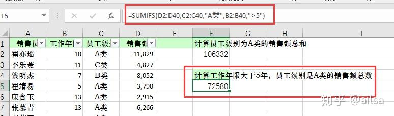 计算工作年限大于5年,员工级别是A类的销售额总数