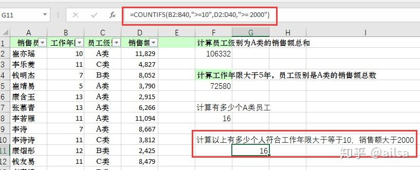计算以上有多少个人符合工作年限大于等于10,销售额大于2000