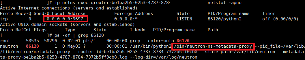 Neutron-ns-metadata-proxy 利用在 unix domain socket 之上的 HTTP 技术,实现了不同网络命名空间之间的 HTTP 请求转发。并在请求头中添加’X-Neutron-Router-ID’和’X-Neutron-Network-ID’信息,以便 Neutron-metadata-agent 来辨别发送请求的虚拟机,获取虚拟机的 ID。