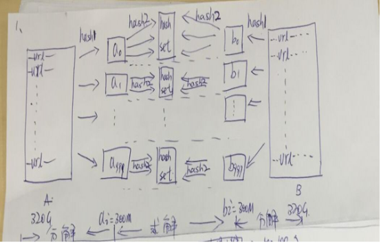 通读文件b,采取和a相同的方式将url分别存储到1000小文件(记为b0,b1,...,b999)。这样处理后,所有可能相同的url都在对应的小文件(a0vsb0,a1vsb1,...,a999vsb999)中,不对应的小文件不可能有相同的url。然后我们只要求出1000对小文件中相同的url即可。