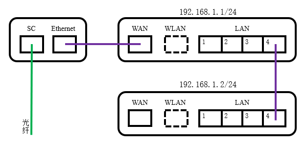 在此场景中,两台路由器的LAN口通过双绞线互联,成为同一个物理网段(二层广播域),任意LAN口间通信无需LAN口IP地址的参与。两台路由器的LAN口IP地址分别为192.168.1.1和192.168.1.2,前缀长度均为24位,属于同一个逻辑网段(三层网段);直连光调制解调器(光猫)的设备LAN口IP地址充当所有终端的默认网关,同时也作为Web管理地址(输入http://192.168.1.1/进入设备1的管理界面);第二台设备的LAN口IP地址仅作为Web管理地址(输入http://192.168.1.2/进入设备2的管理界面),不承担数据转发功能。