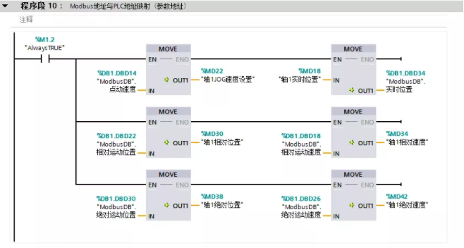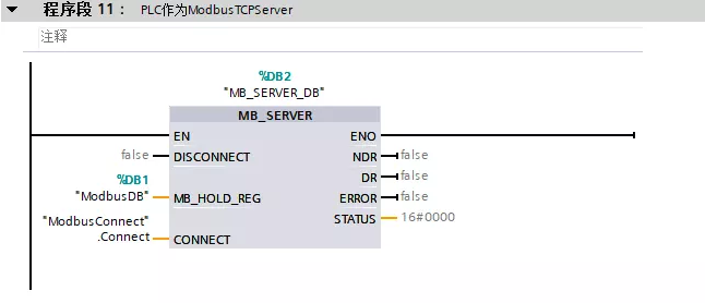 从公开免费和使用范围的角度来考虑,这里采用ModbusTCP通信协议,因为学会了ModbusTCP,意味着市场上的大部分仪表、PLC通信都可以搞得定,PLC程序编写如下如下所示: