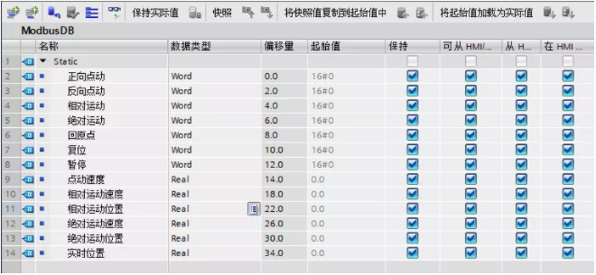 这里首先创建一个DB块,里面包含了常用的一些操作和参数设置,值得注意的是,由于Modbus保持型寄存器的Bit位操作比较麻烦,因此这里我们统一使用Word类型来代替Bit。
