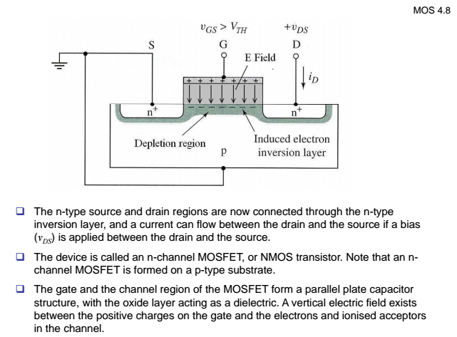 当我们给Gate施加一个正电压的时候,Gate的上层带正电,下层则带了负电。但因为Gate是个不导电的金属氧化物,所以它的下部会形成一个n type 通道(induced electron inversion layer)--电子可以直接从Source流到Drain。于是,我们得到了一个电流通路。