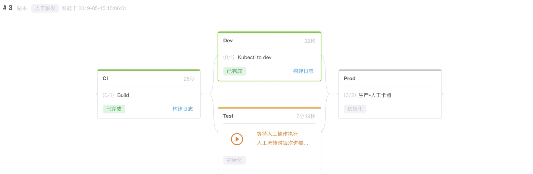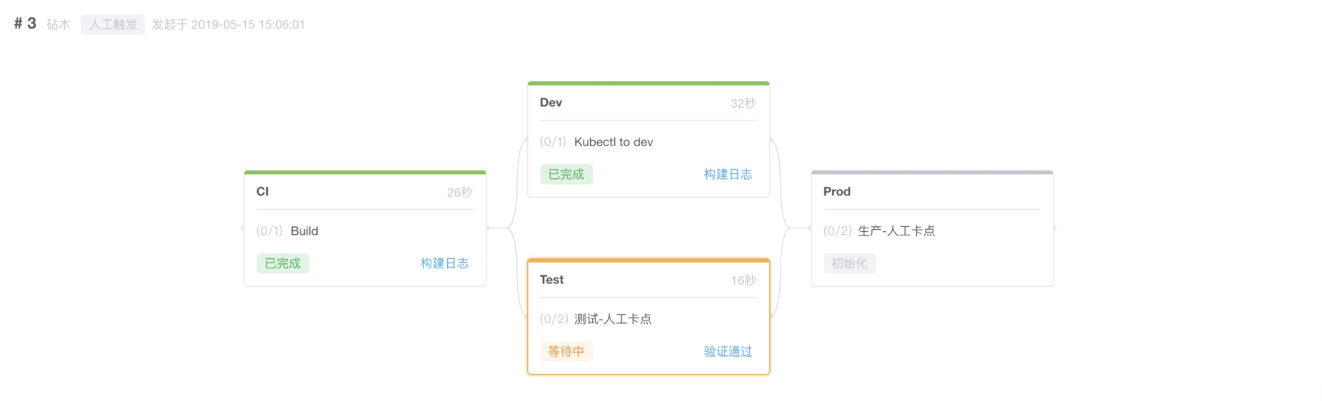 在流水线中我们分别创建:CI(持续集成),Dev(开发环境部署),Test(测试环境部署),Prod(生产环境部署)4个阶段。同时为了实现不同角色之间的协作与工作流转。我们将CI,Dev阶段设置为自动执行,Test,Prod为手动执行,并且增加了相应的人工卡点以确保只有相应角色的人员能够确认开始执行部署动作。