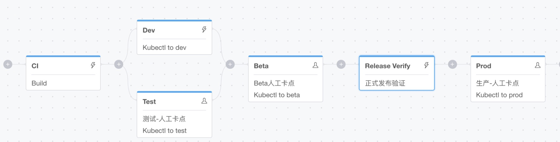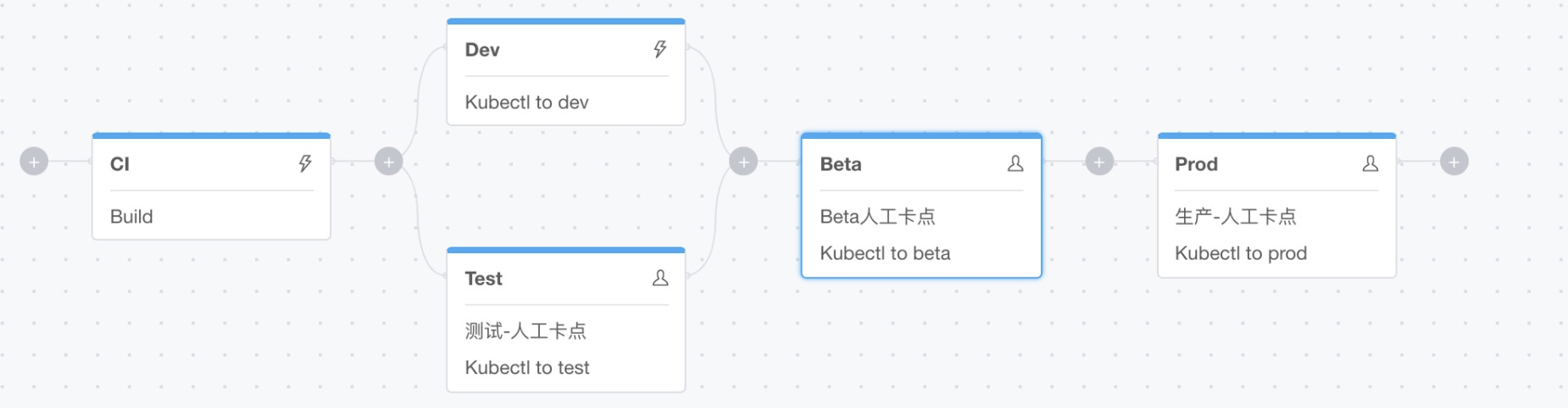或者在Beta以及Prod阶段再增加一个只包含人工卡点的阶段,在这种场景中我们可以由专门角色的人员负责正式部署前Beta环境的验证,并且只有在验证通过之后才能进行Prod环境的发布: