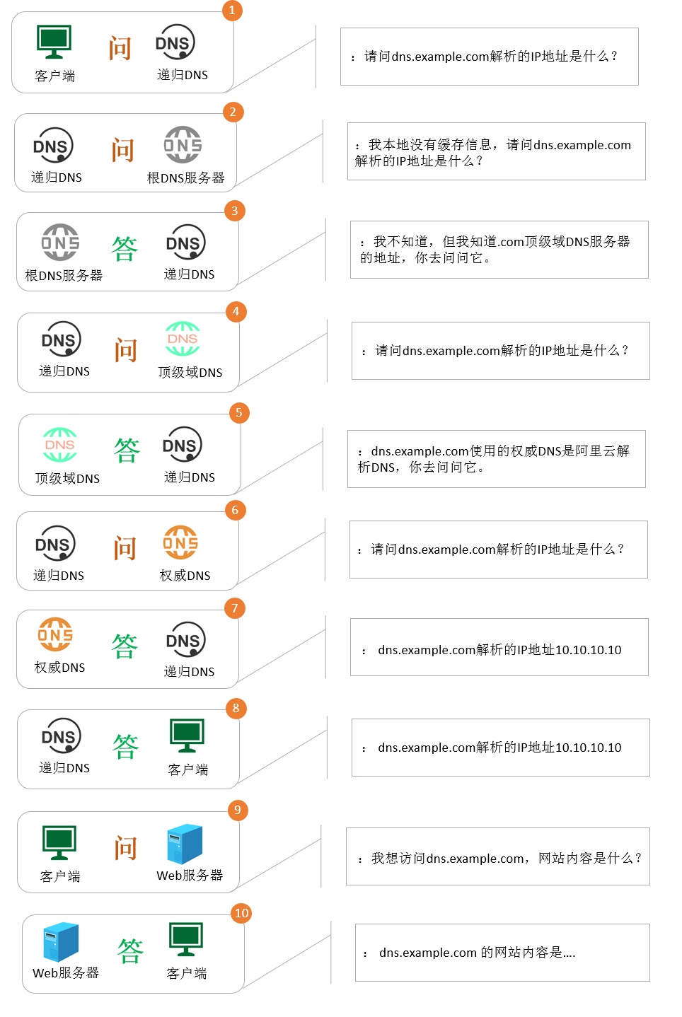 在进入进阶版前,要深入了解域名解析异常情况,绕不开的就得先了解域名解析递归流程,很多同学应该还不知道解析的110套路,简单来说就是在递归DNS未有缓存场景下,1次域名解析需要经历10次查询交互。