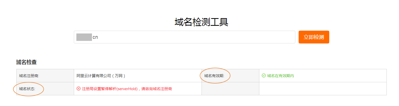 ③ 最后我们再加深了解如何定位原因与解决。 阿里云DNS为用户提供了 域名检测工具,可一键查询出域名有效期和域名状态是否存在异常。