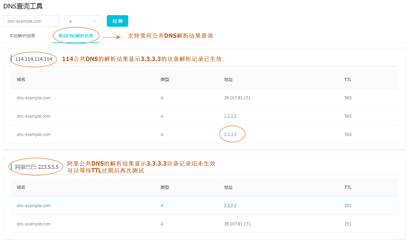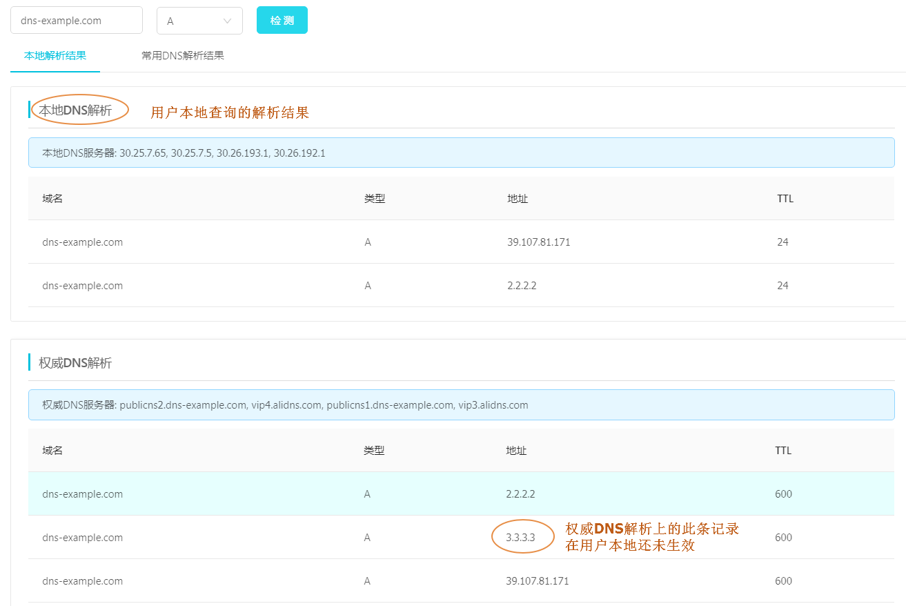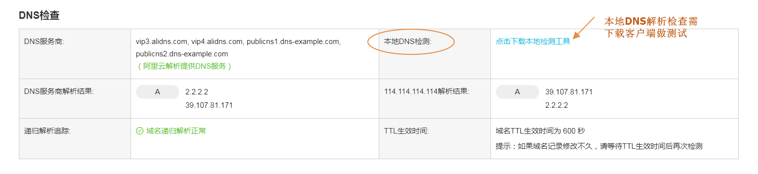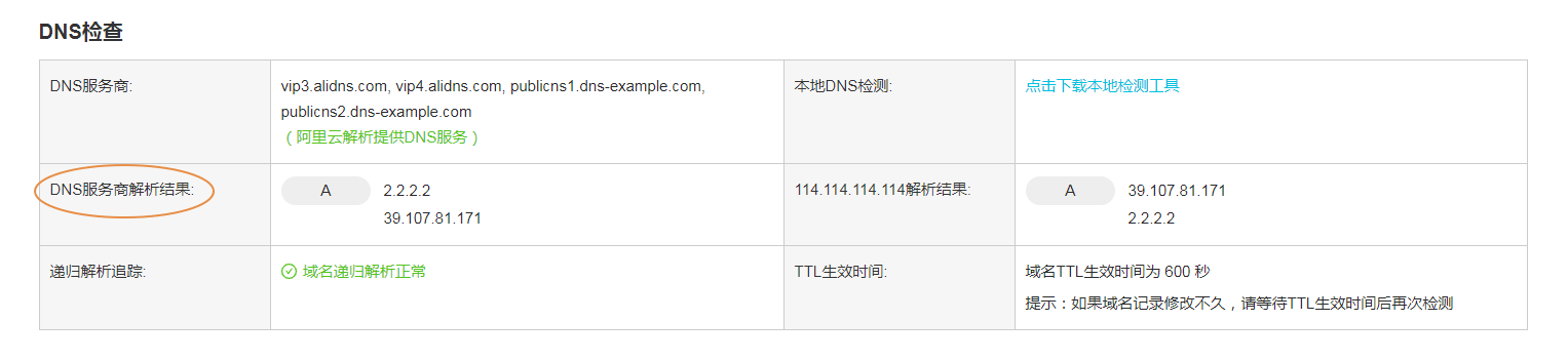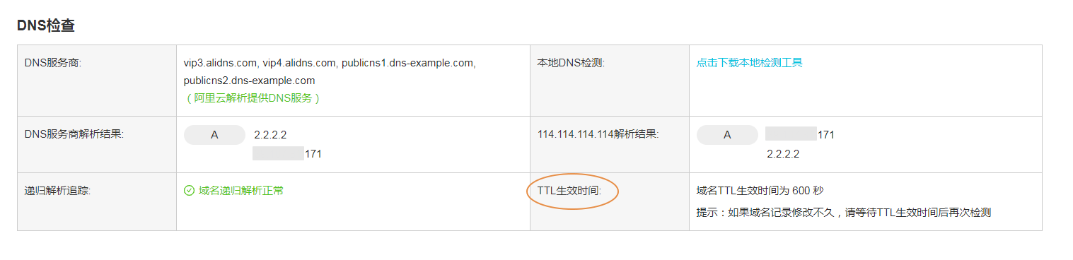②检查是否近期刚修改过解析记录。 如果修改了解析记录,需要等待各地的运营商Localdns的缓存到期,域名解析才会生效。一般修改解析后的生效时间取决于域名的TTL设置。您可以通过 域名检测工具 查出TTL生效时间,等待此TTL生效时间后再次检查。