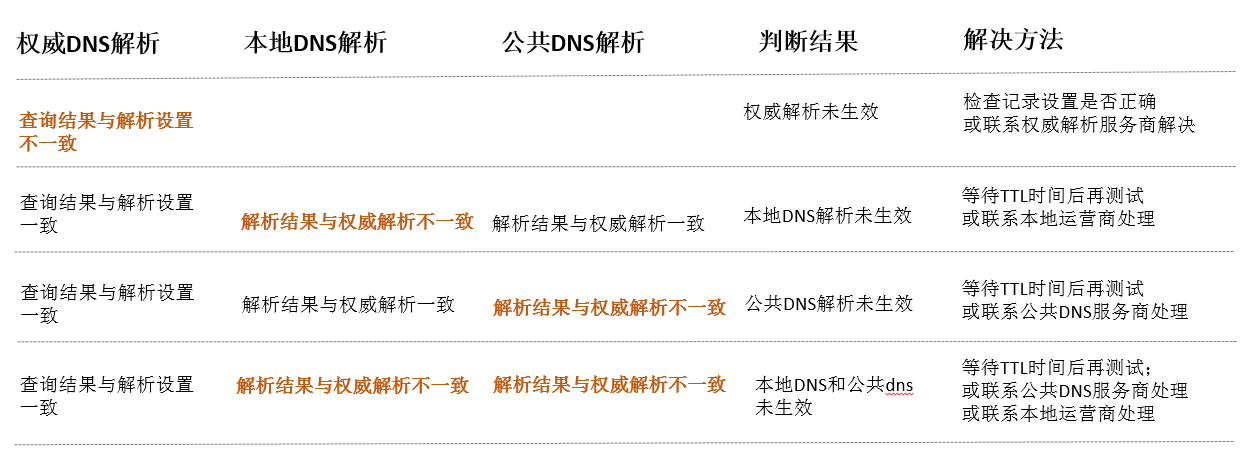 ① 检查解析结果和您在DNS服务商控制台处设置的解析记录对比是否一致,如一致代表权威DNS解析是正常生效的。 ② DNS服务商解析结果显示DNS未设置解析记录,则需要检查您是否为忘记设置或误操作过删除等行为。 ③ 检查结果和您在DNS服务商控制台设置的解析记录不一致,此种场景则需要联系您的DNS服务商进行解析数据刷新处理。