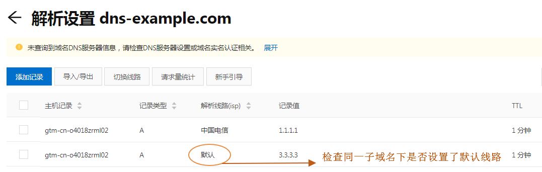 ③检查智能解析线路是否未设置默认线路 云解析DNS的智能解析线路,解析优先级是按照“专线”线路、“默认”线路的排序应用,如果访问者来源不属于“专线”线路,而管理员又未设置“默认”线路场景,则会造成此部分用户无法访问站点。