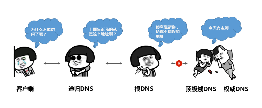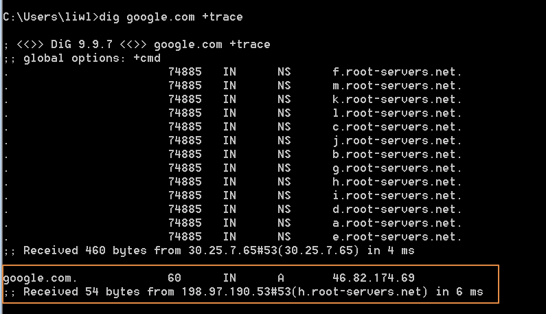 您也可以通过命令dig+trace测试,本地DNS向根DNS服务器查询时,直接返回了IP地址,则一般可判断为在DNS查询在根DNS服务器处就被阻断。