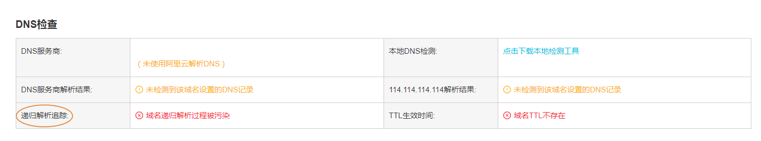 ①通过域名检测工具,如递归解析追踪报错“域名递归解析过程被污染“。