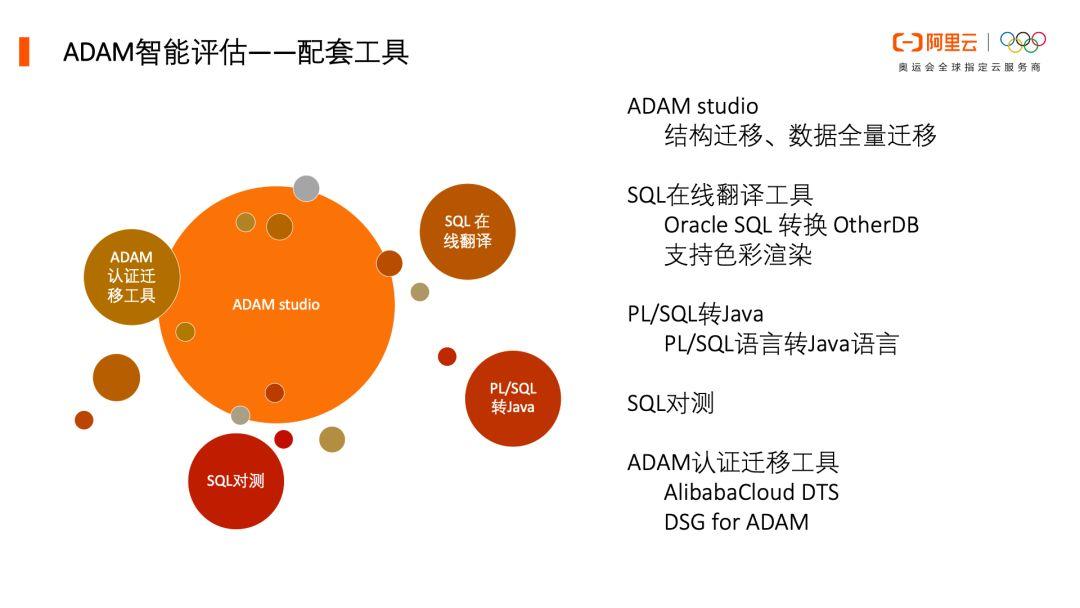 ADAM Studio是Oracle迁移改造产品,能够提供稳定、易用的数据库迁移测试与改造工具集,支持自动生成割接迁移计划,实现仿真与割接环境计划自动同步。 DSG for ADMA是ADAM认证Oracle迁移割接与同步产品,能够提供稳定、可靠的数据迁移与校验工具集,以ADAM迁移计划为核心,提供场景化、流程化、自动化的数据全量迁移、增量迁移、数据校验、数据修正能力。 数据传输工具DTS是阿里云数据库传输工机具,同样支持数据源间的数据交互,能够帮助用户实现全量和增量迁移数据。