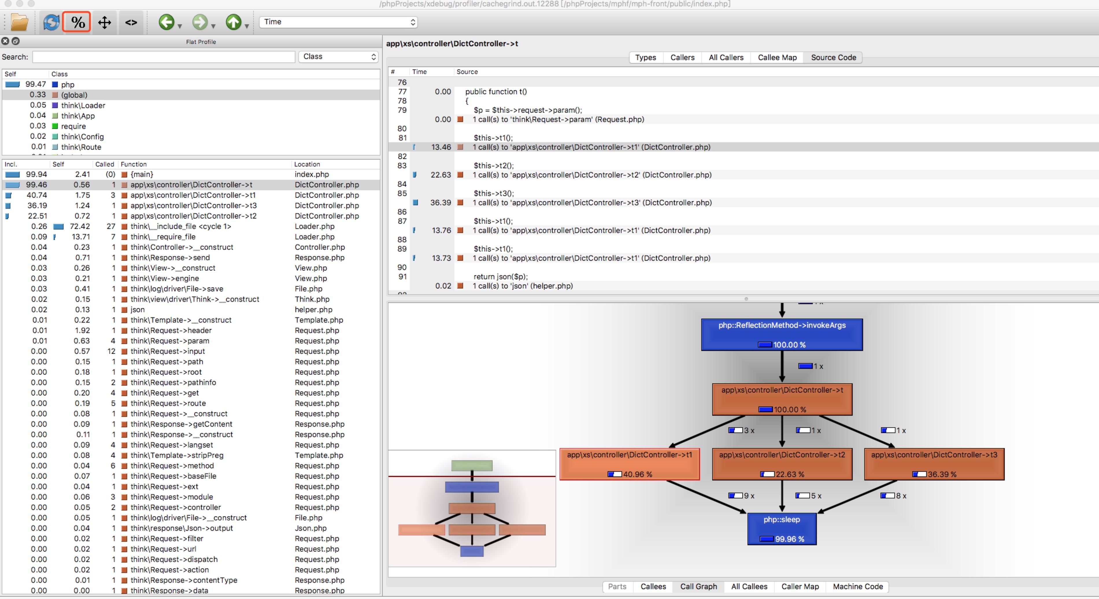 通过这个图我们一眼就能发现t方法的耗时最终都在 php的sleep方法上面。是不是有简单,又高效。qcachegrind 还有很多其它的功能,欢迎留言分享。
