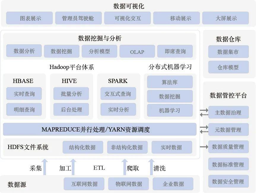大数据平台 1.0 时期,其实就是我们通常所看到的国内“传统大数据平台”的概念,此时的大数据平台是以处理海量数据存储、计算及流数据实时计算等场景为主的一套基础设施,以 Hadoop、Spark、Hive 等作为大数据基础能力层,在大数据组件上搭建包括数据分析,机器学习程序等 ETL 流水线,以及包括数据治理系统、数据仓库系统、数据可视化系统等核心功能。