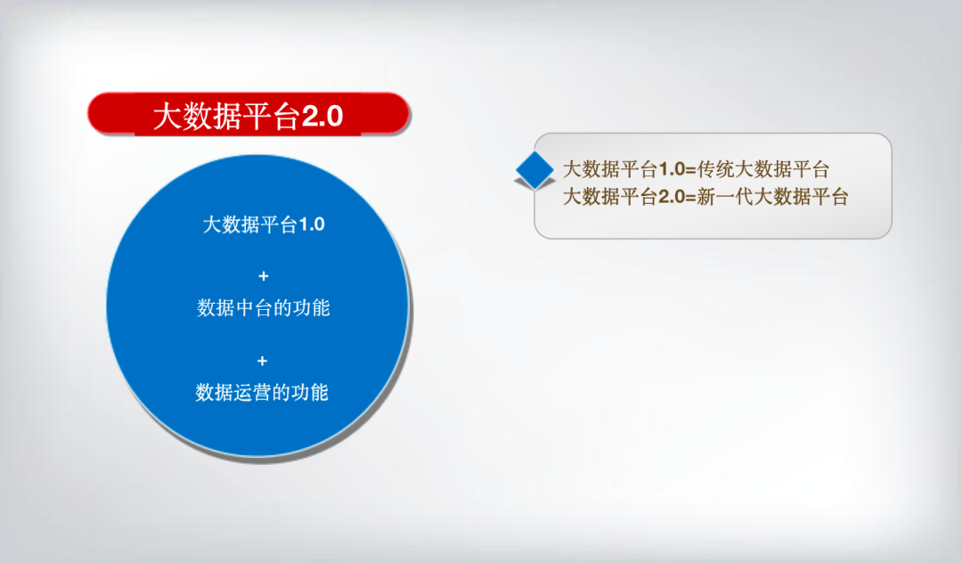 大数据平台 2.0 = 新一代大数据平台=大数据平台1.0+数据中台的功能+数据运营的功能。