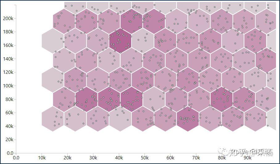散点图展示在不同的六边形中,色彩饱和度表示每个六边形中点的密度,点越多,颜色越深。