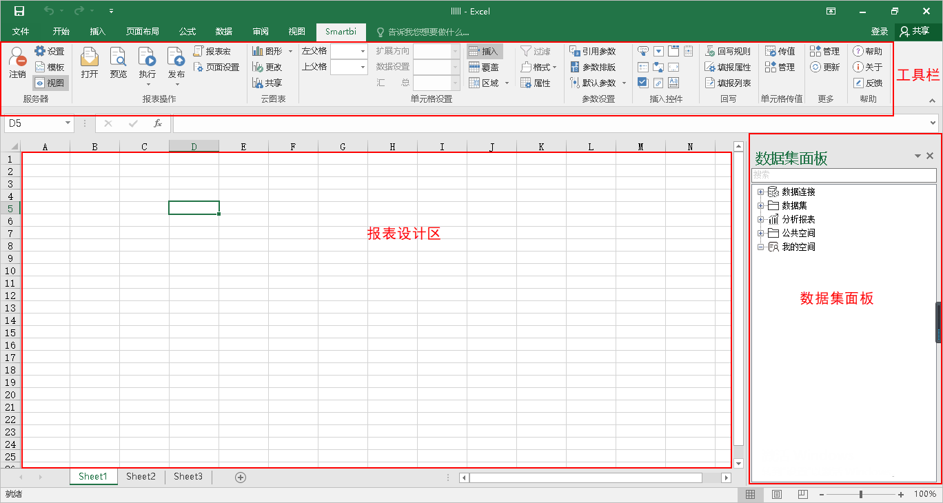 最近公司项目需要用到报表,公司领导要求我来调研下报表工具。开始的时候了解了目前市场上功能强大,占有率高的两款报表工具,帆软报表和润乾报表,这两款报表工具功能比较强大,覆盖的行业较广,基本能满足所有的报表需求,但是价格都比较昂贵。由于公司项目预算问题最终放弃了这两款报表。 调研中无意之间发现了一款免费的报表工具——Smartbi报表工具,官网介绍说是一款开源的web报表工具,可以通过浏览器直接对报表进行制作和管理,仅通过简单拖拽,就可以制作想要的报表,并且可以无缝结合到其他系统中。迅速下载体验了一番,根据官网环境文档配置了报表环境,根据官网文档操作手册试着做了几个报表,下面是大概的产品体验: 类Excel设计模式 Smartbi设计报表器界面与Excel类似,熟悉Excel的用户不需任何额外学习成本,一般用户也能在阅读Smartbi报表帮助文档后快速掌握设计器的使用。报表设计界面简单易用,不懂技术的最终用户也可以学会和使用它来制作报表模板。界面如下图所示: