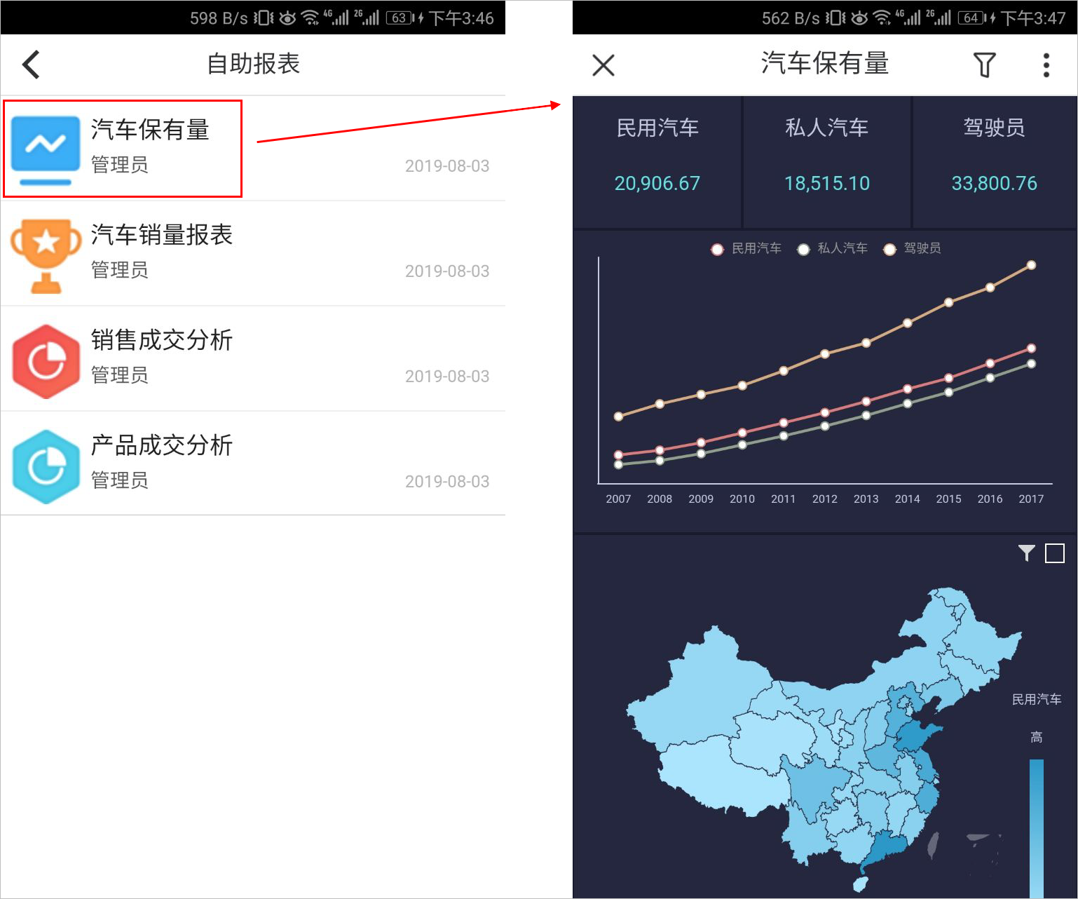 移动驾驶舱 不同于其他web报表插件,不重视移动端或压根没有移动,Smartbi的移动端功能十分强大。Smartbi可以帮助企业用户构建自己的移动BI,使用者可以在iphone、ipad及android智能手机上访问平台、浏览处理报表,查看分析企业的数据,而且可以得到适应于移动化的更优质的用户体验。个性化、人性化的定制和使用是先进信息化管理系统的重要特征。 手机效果