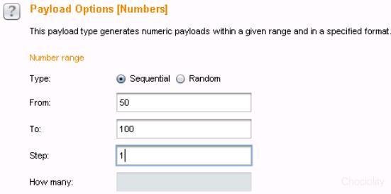 6.选择数字之后,我们填写数字范围。因为是已经暗示了密码范围,所以我们选择50到100.顺序生成,每步加1(step设置):