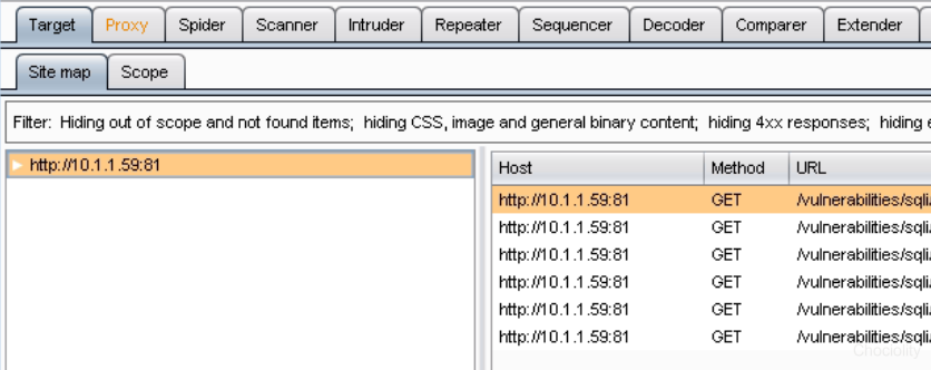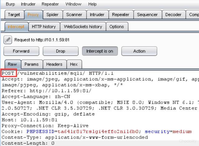 1.使用Burpsuite的代理功能: 访问http://10.1.1.59:81,输入用户名:admin,密码:password,打开burpsuite,设置好浏览器代理,点击sql injection: