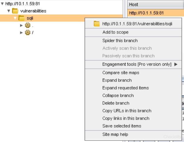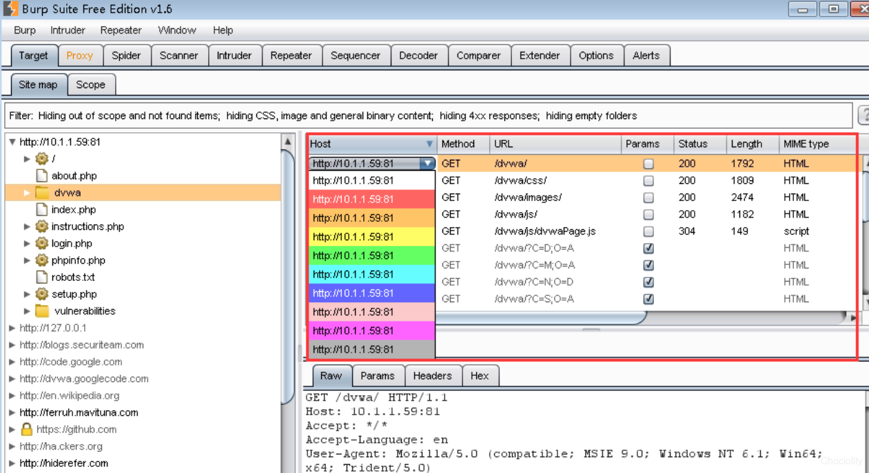 点击Spider this branch,burp就会对该目录进行爬行。 点击Expand branch来展开分支,其他功能不是很常用,有兴趣可以自行研究哦。 Site map选项卡右边可以看到一些请求的信息,在Host下可以选择对链接进行高亮显示,comment下可以添加注释,针对单个链接也可进行右键操作。