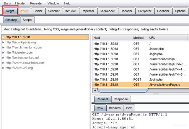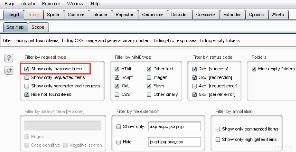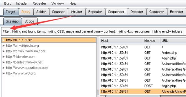 Do intercept下Response to this request功能可用于对服务端发送过来的信息做修改来欺骗浏览器。 如果开启URL-encode as you type表示对你输入的&,=等字符将会被URL编码替换。 2.Target模块: 这个模块下有两个选项卡,Site map主要是将爬行的站点以树形结构显示,Scope主要是用来设置范围进行过滤。 有时当我们对一个目标网址进行测试时,Site map下会出现许多不相关的网址,我们可以使用Filter来过滤,只留下目标网址: