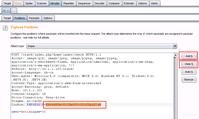 Positions设置是选择我们要暴力破解的位置。在默认情况下,burp会自动将所有的变量都勾选上。实际操作中,我们往往是针对单一点,选择“clear$”,此时所有默认的爆破点都已经消失。 (2)用鼠标选中需要暴力破解的变量的值。然后右侧选择“add$”,这样我们就添加了一个爆破点,这个爆破点的payload位置是在两个“$”之间的部分。