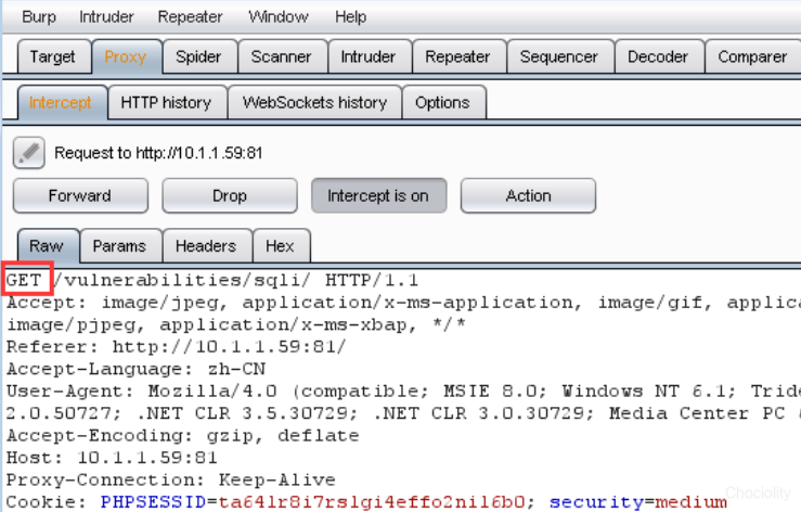 这表明我们已经成功的截获了来自浏览器的请求。 点击forward就可以把这个请求发送给服务器,服务器会将结果返回给浏览器中,并将响应在burp中记录下来。Drop会将这个包丢掉,即不会发送到服务器端。