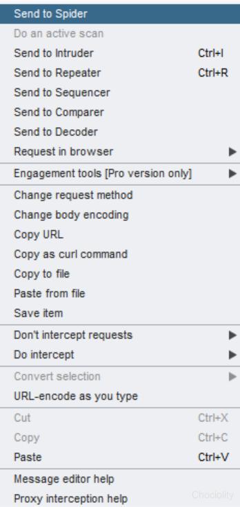 Send to XXX分别表示将截获的数据发送到各个模块,然后在各模块下进行下一步操作。 下拉菜单,点击Send to Spider切换到Spider模块下,burpsuite会自动对网站进行爬行,切换到Control选项卡下可以查看爬行的状态和设置爬行范围,Options选项卡中可以进行爬行的设置等。一段时间后切换到Target模块查看结果: