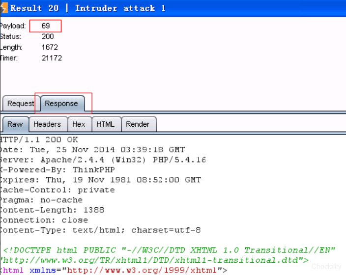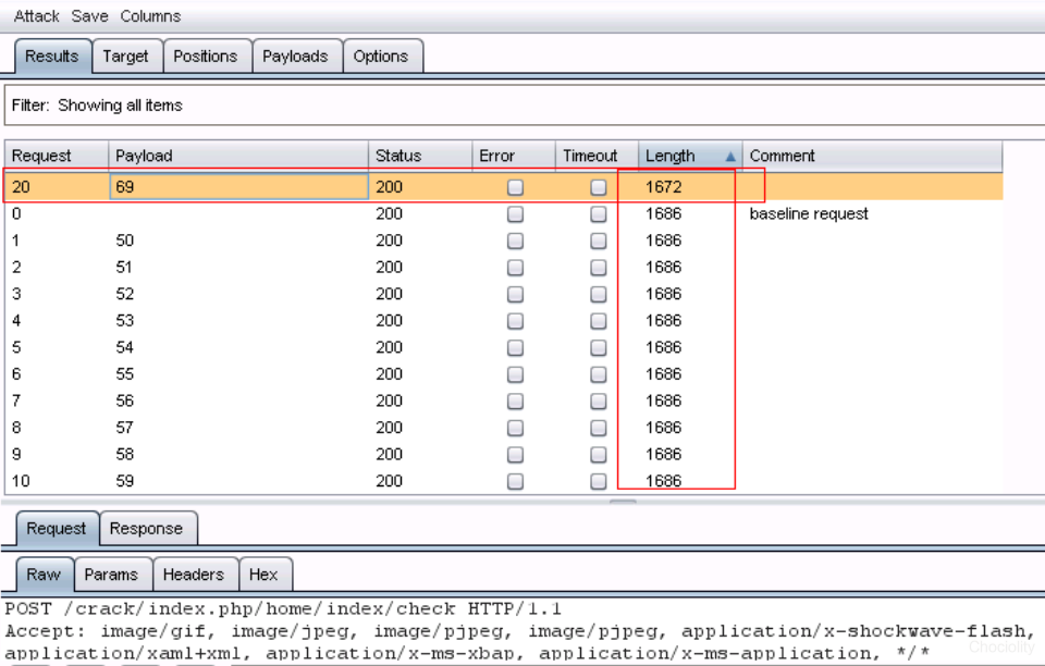 我们发现,在测试的50个payload中,payload为69的返回值不同与其他payload返回值。我们怀疑69就是答案。我们来观察一下。 在payload为69的request上双击,进入后选择response。浏览response,直到发现:“you got it.