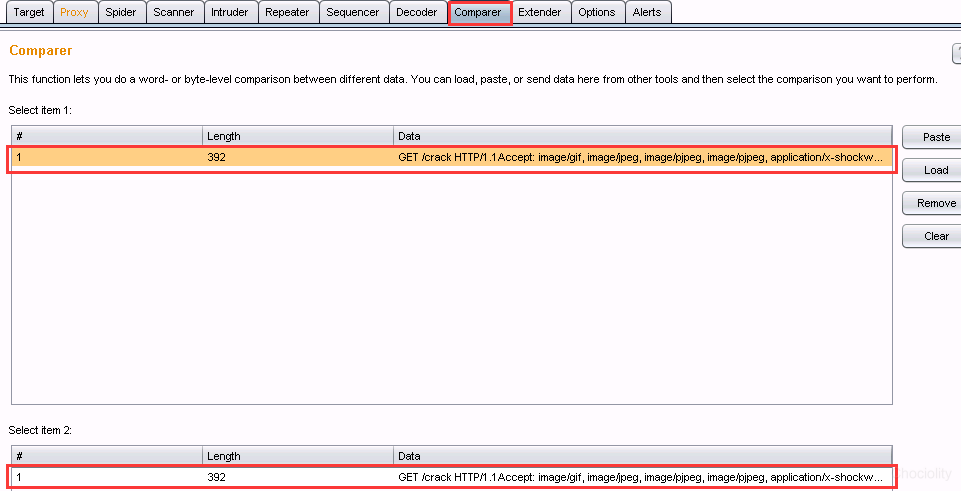 也就是说,服务器对多次测试并没有加以限制,因此我们可以使用暴力破解了。 为了再次验证,我们在登陆界面再次输入一个不同的密码。在我们将两次请求的响应使用comparer去比对一下。(在proxy中选择子选项卡HTTP History,选择方法为post的两个历史记录,点击每一条post记录,下方会看到不同的post数据时,这应该就是我们的两次不同密码的请求记录,右键选择send to comparer(response)):