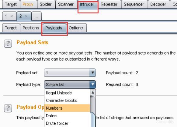 5.打开payload选项卡,payload type选择数字: