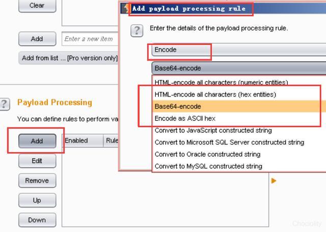 有时候我们需对payload进行二次处理,比如md5加密啊,base64加密啊之类的,burp当然也考虑到了这一点。在payload processing中集成了一些常见的算法。 点击add,在弹出的窗口中就可以根据需要选择了。
