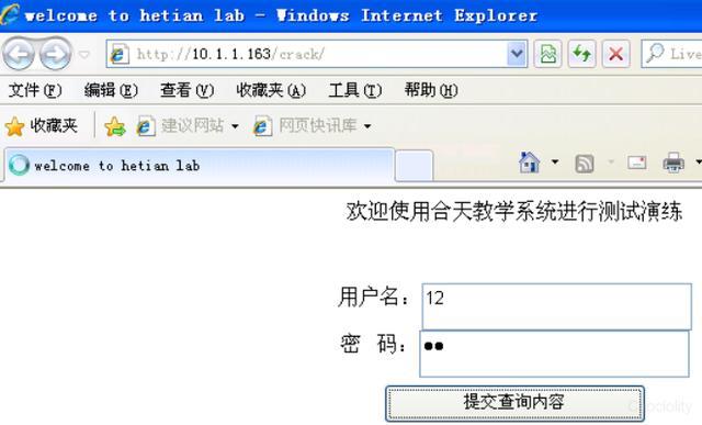 下面尝试对密码的爆破:已知用户名为hetian,密码为50-100之间的某个数。 1.访问http://10.1.1.163/crack/,这是一个登录界面: