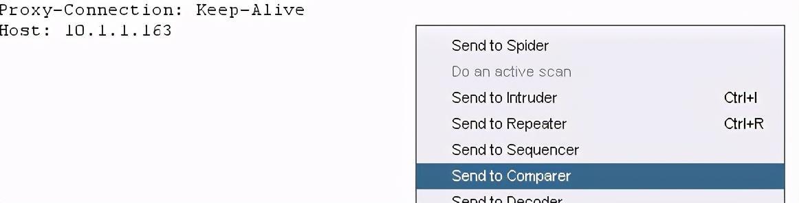 熟悉comparer,repeater,intruder模块。 1.compare模块: compare模块可以将不同的数据包(无论是请求包还是响应包)进行比较。 首先,我们添加一条请求到compare模块去。 在已经截取的数据包上面右键,选择send to comparer: