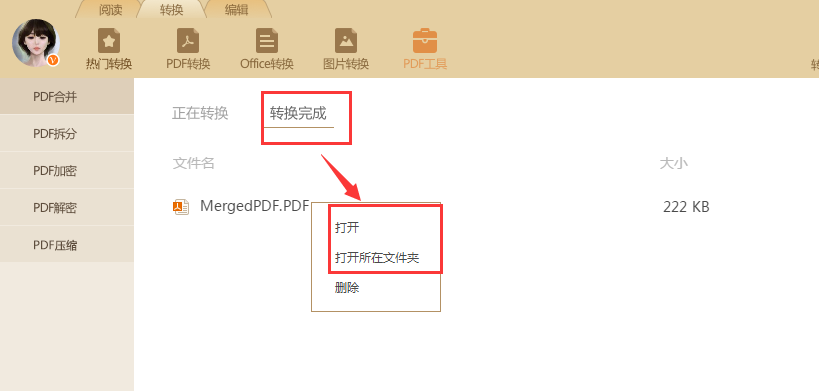 除了在上一步的输出路径(没有设置点击打开目录即可)找到合并后的PDF文档外,还可以在转换完成中的转换记录处右击选择打开即可。