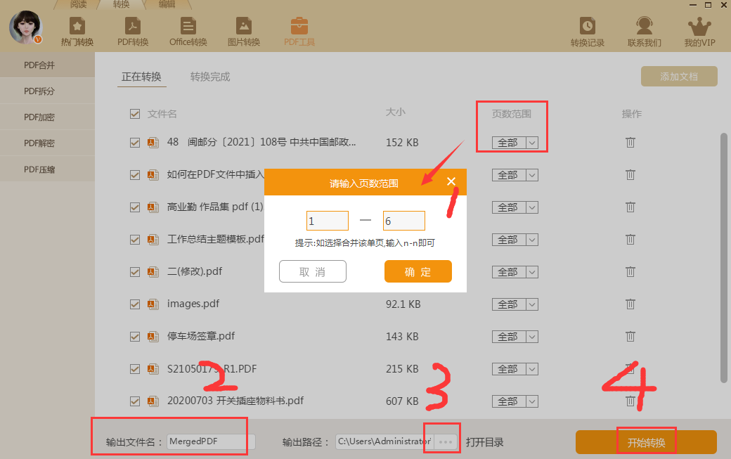 接着最重要的一步就是分别设置每一个PDF文档需要进行合并的页面范围,设置完成后,在左下角输出文件名输入一个合并后新文档的名称,并在输出路径中修改保存位置后,最后点击开始转换就可以了。