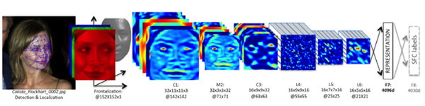 后3层,采用Local-Conv,提人脸不同位置上的各种不同特征,因为Local-Conv参数量巨大,所以需要使用超大的数据库进行训练。DeepFace采用的是Facebook自己做的SFC数据集,有4030个人的440万张人脸数据。所以用在这里正好~